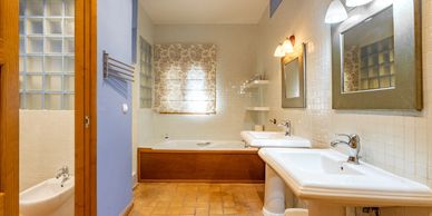 Baño Principal: bañera hidromasaje, ducha, zona de wc y videt, dos lavabos.